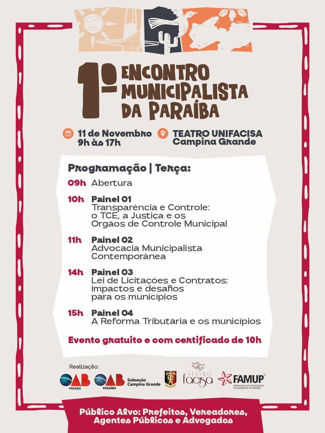 O 1º Encontro Municipalista da Paraíba de Direito Municipal promovido pela Federação das Associações de Municípios da Paraíba (Famup) e a Ordem dos Advogados do Brasil – Seccional Paraíba (OAB-PB) terá debates sobre licitação, transparência e reforma tributária. O encontro, que acontece no próximo dia 11 de novembro, em Campina Grande, no Teatro Facisa, conta com o apoio do Tribunal de Contas do Estado da Paraíba (TCE-PB) e da subseção da OAB-Campina Grande. As inscrições podem ser feitas pelo link https://doity.com.br/