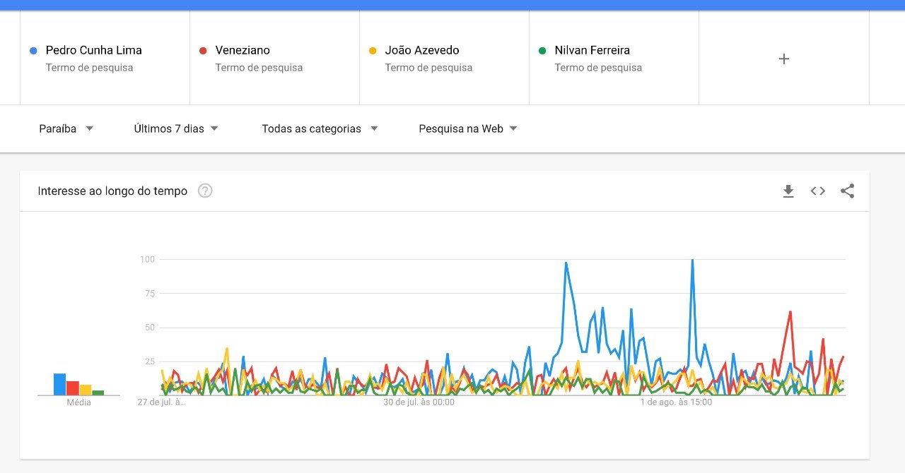 As buscas por Pedro Cunha Lima na internet tiveram um salto impressionante nos últimos dias, é o que mostra o Google Trends, que analisa o volume de pesquisas realizadas no Google em um dado período. No último dia 31, quando aconteceu a homologação da sua candidatura, Pedro atingiu o pico máximo (100) da plataforma, superando as buscas por todos os pré-candidatos nos últimos 7 dias, inclusive Veneziano, que ontem esteve em ato com o ex-presidente Lula e o ex-governador Ricardo Coutinho.