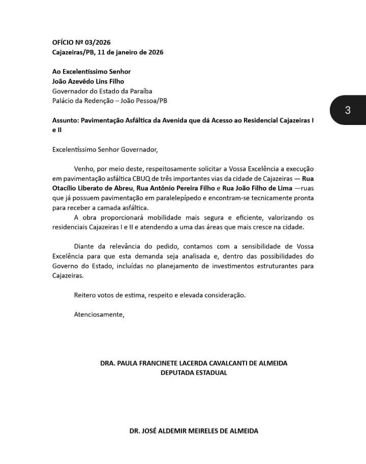 Já Zé Aldemir ressaltou que o pleito foi encaminhado ao governador João Azevêdo em consonância com outras demandas do município. Segundo ele, a prefeita de Cajazeiras já havia solicitado a pavimentação de 50 ruas da cidade. “Com esse pedido das 25 ruas que apresentamos juntamente com a deputada Doutora Paula, Cajazeiras pode chegar a 75 ruas pavimentadas. É um avanço significativo para a cidade, fruto de união e compromisso com o desenvolvimento do nosso município”, destacou.