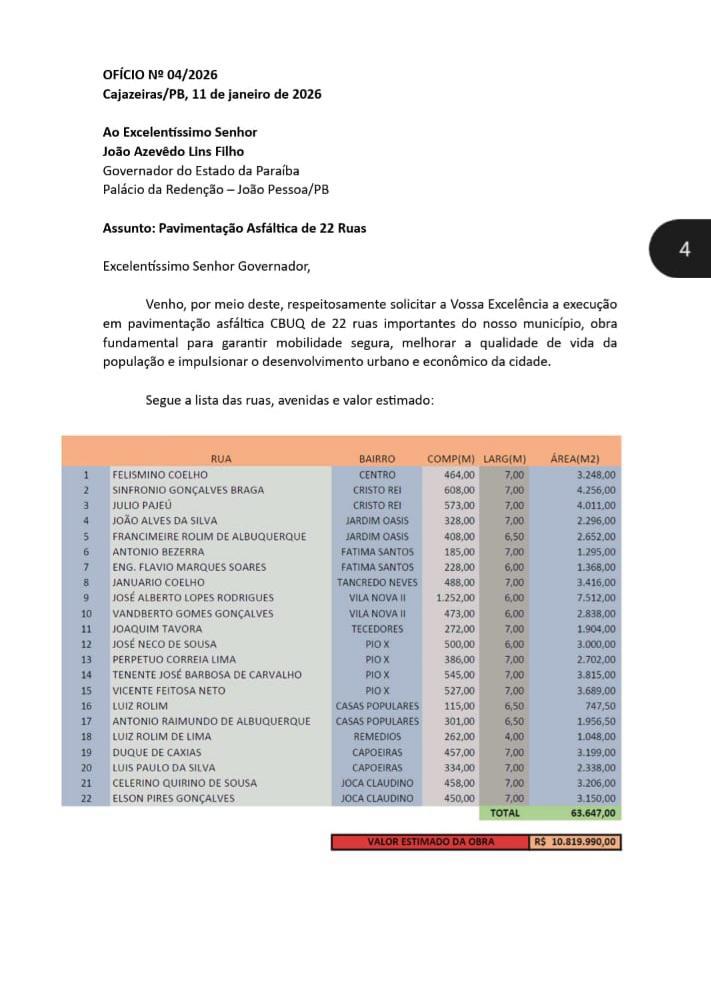 A expectativa agora é que o Governo do Estado analise a solicitação e inclua as vias no cronograma de obras, ampliando os investimentos em infraestrutura e promovendo mais qualidade de vida para a população cajazeirense.