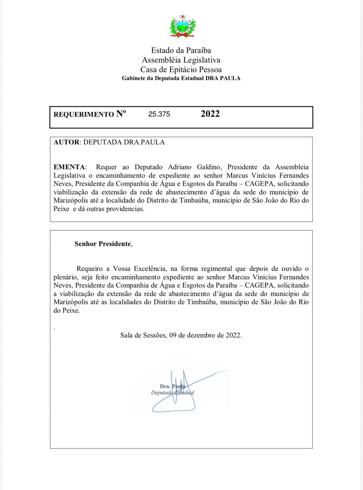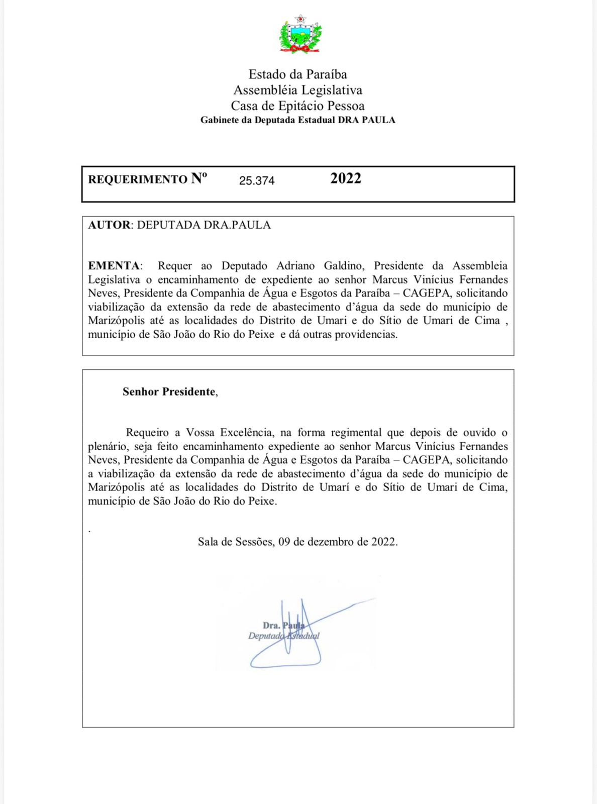 A forte atuação parlamentar da deputada estadual Doutora Paula (Progressistas), aliada ao diálogo constante com o Governo do Estado, resultou em mais uma conquista histórica . Foi publicado no Diário Oficial do Estado o investimento de R$ 23,7 milhões que irá solucionar, de forma definitiva, o problema crônico de abastecimento de água no Distrito de Divinópolis, em Cajazeiras, e nas comunidades de Umari de Cima e Umari de Baixo, em São João do Rio do Peixe.