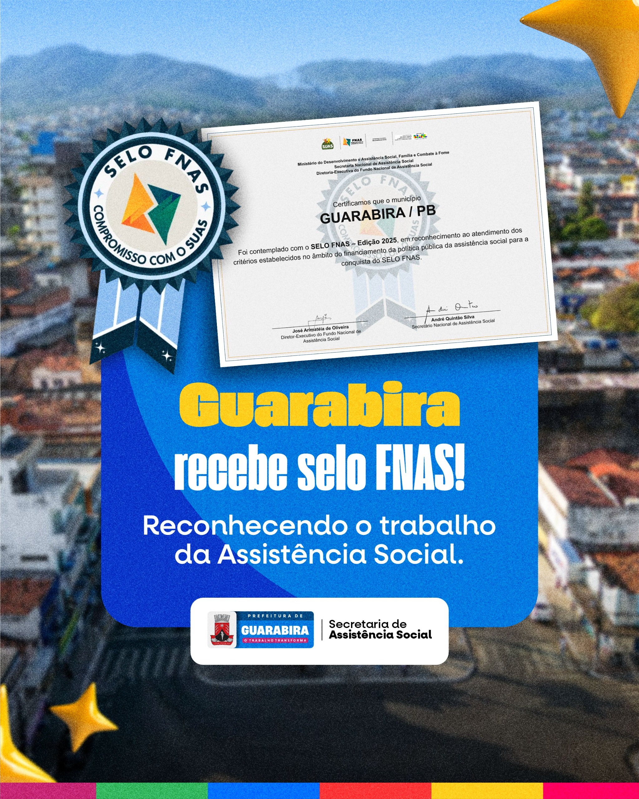 O município de Guarabira foi contemplado com o Selo do Fundo Nacional de Assistência Social, reconhecimento concedido a gestões que se destacam pela qualidade na aplicação dos recursos públicos voltados à assistência social. A certificação evidencia o compromisso da administração com a transparência, a responsabilidade e a eficiência na condução das políticas públicas da área.