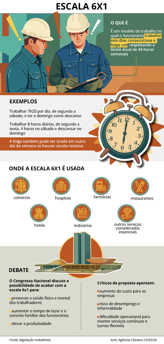 O presidente da Câmara, Hugo Motta (Republicanos-PB), afirmou que pretende levar ao Plenário em maio a votação das propostas de emenda à Constituição que preveem a redução da jornada de trabalho e o fim da escala 6×1. Segundo ele, a admissibilidade da proposta deve ser votada no início do próximo mês na Comissão de Constituição e Justiça e seguir para a comissão especial.