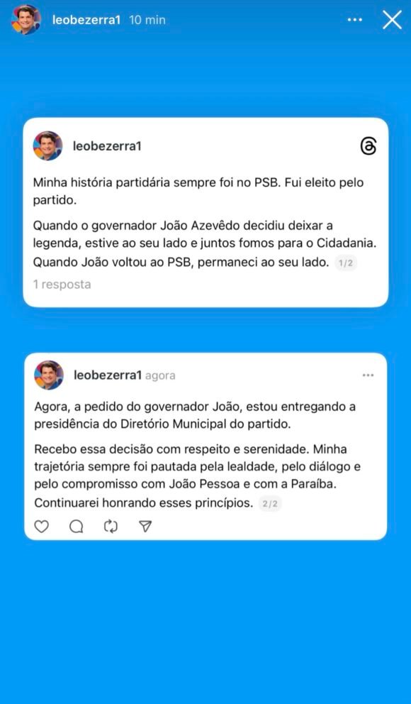 “Minha história partidária sempre foi no PSB. Fui eleito pelo partido. Quando o governador João Azevêdo decidiu deixar a legenda, estive ao seu lado e juntos fomos para o Cidadania. Quando João voltou ao PSB, permaneci ao seu lado”, escreveu Leo em postagem em uma rede social.