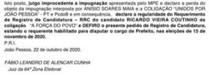 Por não encontrar motivos que impedisse a candidatura de Ricardo Coutinho a prefeito da Capital, o juiz deferiu o pedido de registro de candidatura.
