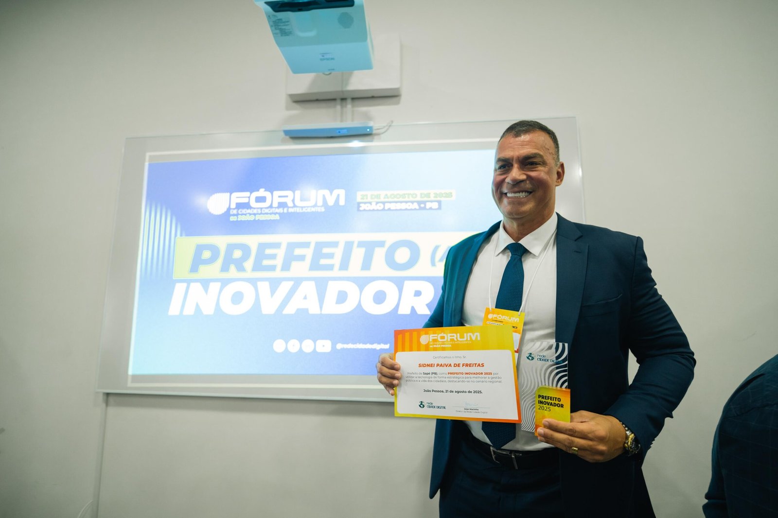 O prefeito de Sapé, Major Sidnei, foi reconhecido, nesta quinta-feira (21), durante o Fórum de Cidades Digitais e Inteligentes de João Pessoa, principal encontro sobre tecnologia para prefeituras da região, que fomenta a transformação digital especialmente em pequenos e médios municípios. O gestor recebeu o prêmio ‘Prefeito Inovador 2025’ pela substituição das luminárias a vapor de mercúrio por modernas lâmpadas de LED em todo o município.