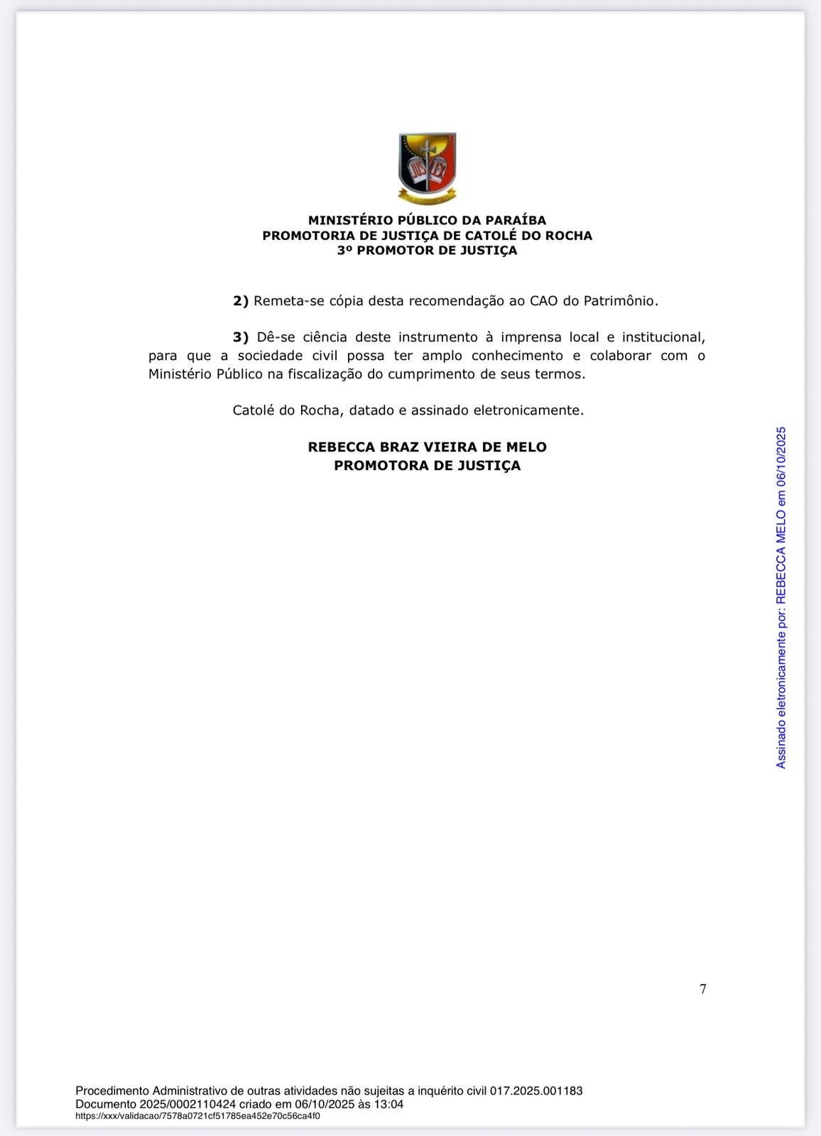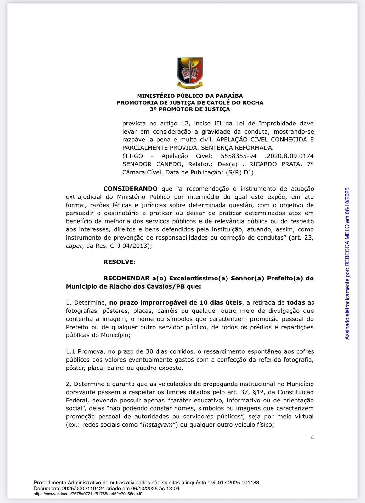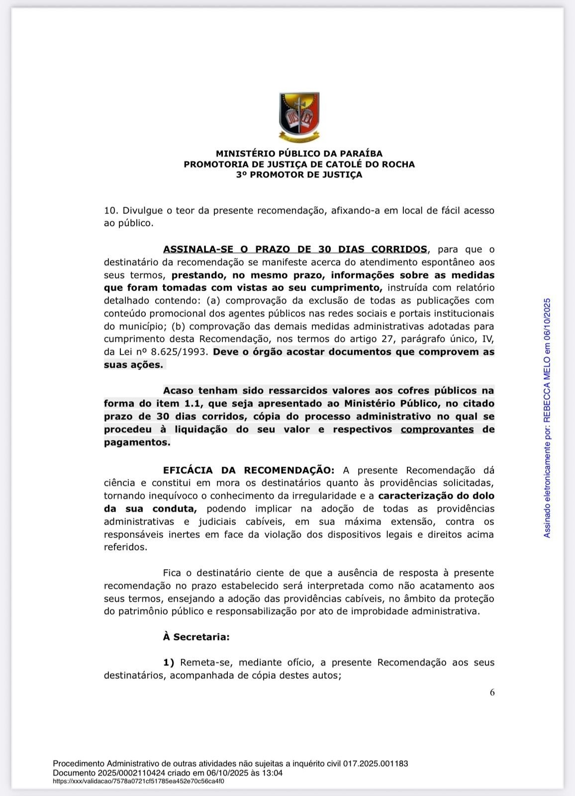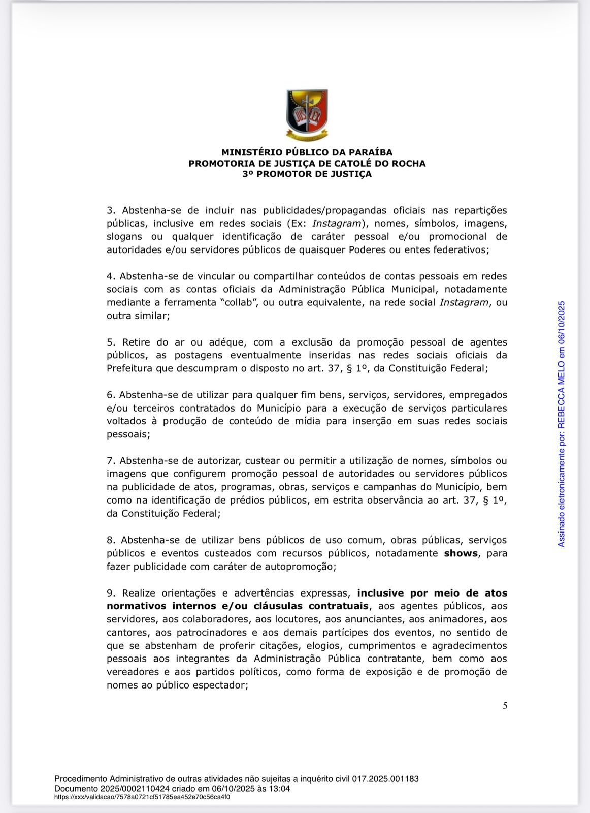 Os prefeitos de Catolé do Rocha, Lauro Maia; de Belém do Brejo do Cruz, Leomar Maia; de Brejo dos Santos, Luciene Almeida; de Bom Sucesso, Tairis Duarte; de Brejo do Cruz, Tales de Sousa; de Jericó, Kadson Monteiro; de Mato Grosso, Jidalva; de Riacho dos Cavalos, Artur Vieira; e de São José do Brejo do Cruz, Cleide Anne, foram orientados a retirar, em até 10 dias úteis, quaisquer imagens, nomes, slogans ou símbolos que configurem autopromoção em prédios públicos, materiais de comunicação e páginas institucionais.