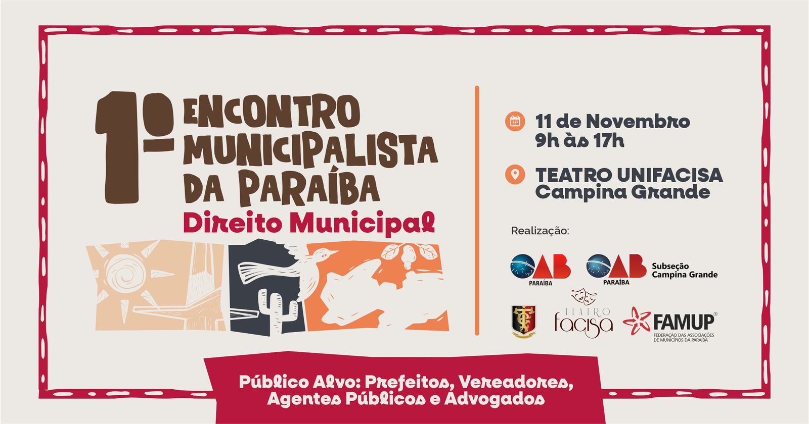 A Ordem dos Advogados do Brasil, Seccional Paraíba (OAB-PB) e a Federação das Associações de Municípios da Paraíba (Famup) realizam, na próxima terça-feira (11), o 1º Encontro Municipalista da Paraíba de Direito Municipal, com debates sobre licitação, transparência e reforma tributária. O encontro acontece no Teatro da Facisa em Campina Grande e conta com o apoio do Tribunal de Contas do Estado da Paraíba (TCE-PB) e da Subseção da OAB de Campina Grande. As inscrições podem ser feitas pelo link https://doity.com.br/encontromunicipalistadaparaiba/.