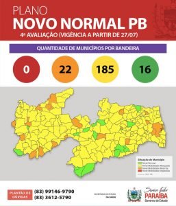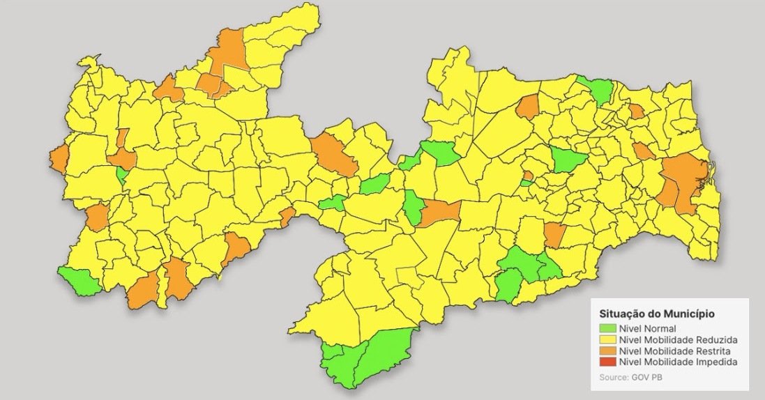 João Pessoa, Campina Grande, Conde, Cabedelo e Cajazeiras estão entre os municípios sinalizados com bandeira amarela. Catolé do Rocha, Bayeux, Santa Rita, Mamanguape e Princesa Isabel estão com bandeira laranja, e Alcantil, Areia, Barra de Santana e Santa Inês estão entre os municípios com bandeira verde.