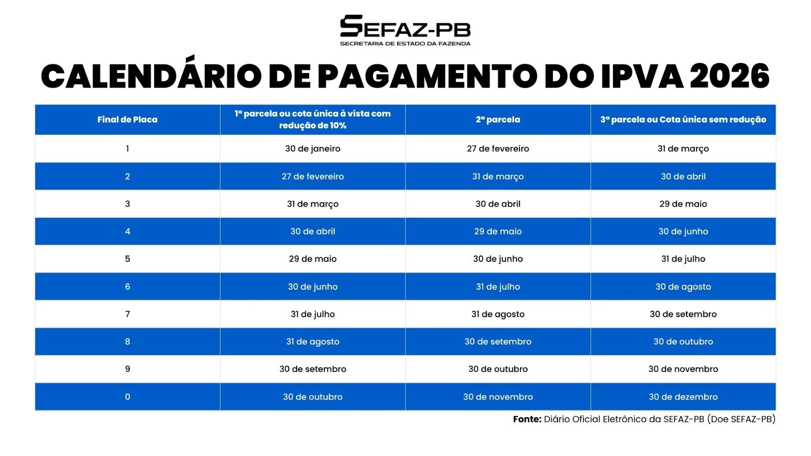 A Secretaria de Estado da Fazenda (Sefaz-PB) já liberou a emissão do boleto da placa com final 1 do IPVA (Imposto sobre a Propriedade de Veículos Automotores) para efetuar o pagamento do exercício de 2026. Os proprietários de veículos no Estado da Paraíba com placa final 1 já podem emitir o boleto do IPVA no portal da Sefaz-PB, por meio do link https://www.sefaz.pb.gov.