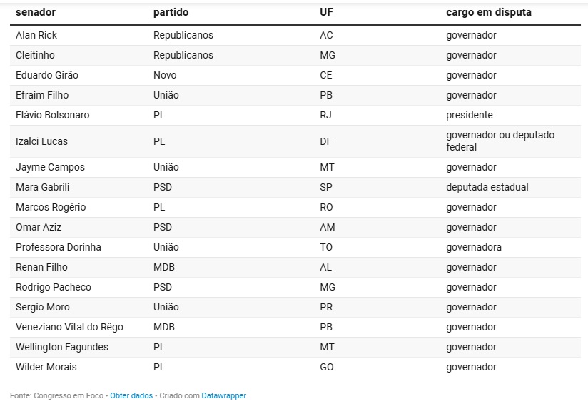 Se deputados veem o Senado como ascensão, senadores enxergam no Executivo estadual uma plataforma de projeção política. Entre os 17 senadores mapeados, 15 aparecem como pré-candidatos ou cotados a governador.
