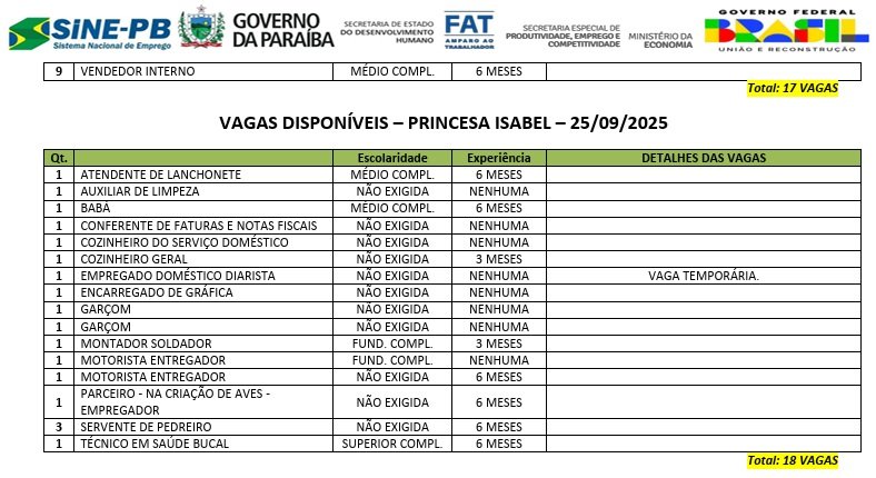 O Sistema Nacional de Emprego da Paraíba (Sine-PB) está disponibilizando, a partir desta segunda-feira (29), 18 vagas de emprego em Princesa Isabel.