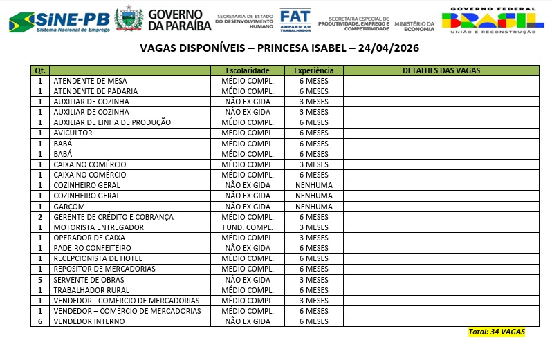 O Sistema Nacional de Emprego da Paraíba (Sine-PB) inicia o mês de dezembro disponibilizando, a partir desta segunda-feira (27), 34 vagas de emprego em Princesa Isabel.